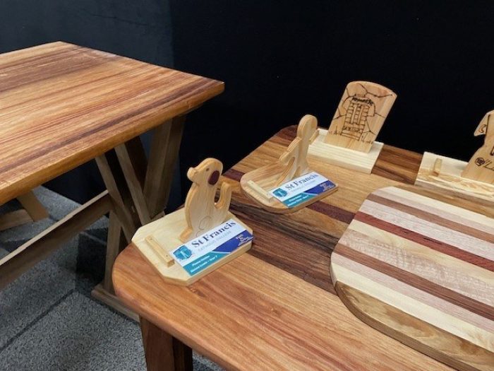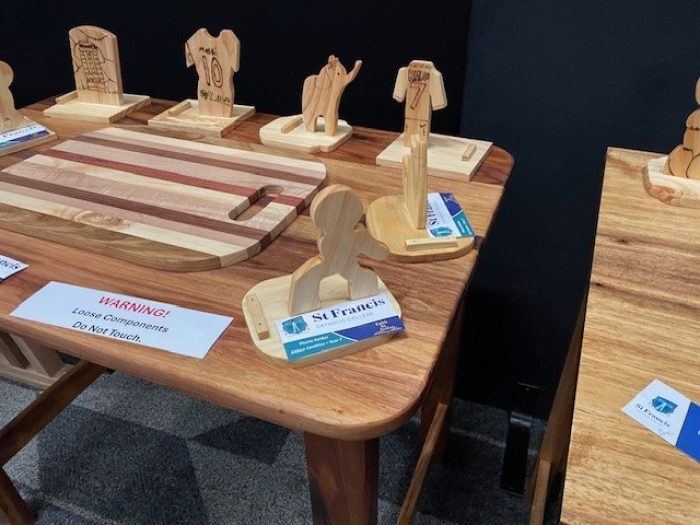 Pictured below: Assorted phone holders made by Year 7 students and cutting boards made by Year 9 students. Displayed on a study desk made by a Year 10 student.