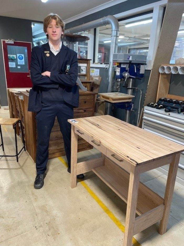 Pictured above, left to right: Year 12 student Aruai and her solid and veneered blackwood chest of drawers, finished in Tung Oil and Year 11 student Cooper with his solid feature grade, resin-filled, Tasmanian Oak study desk.