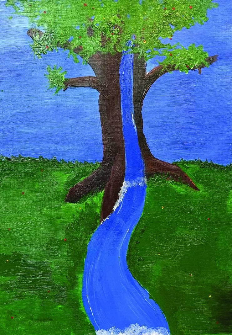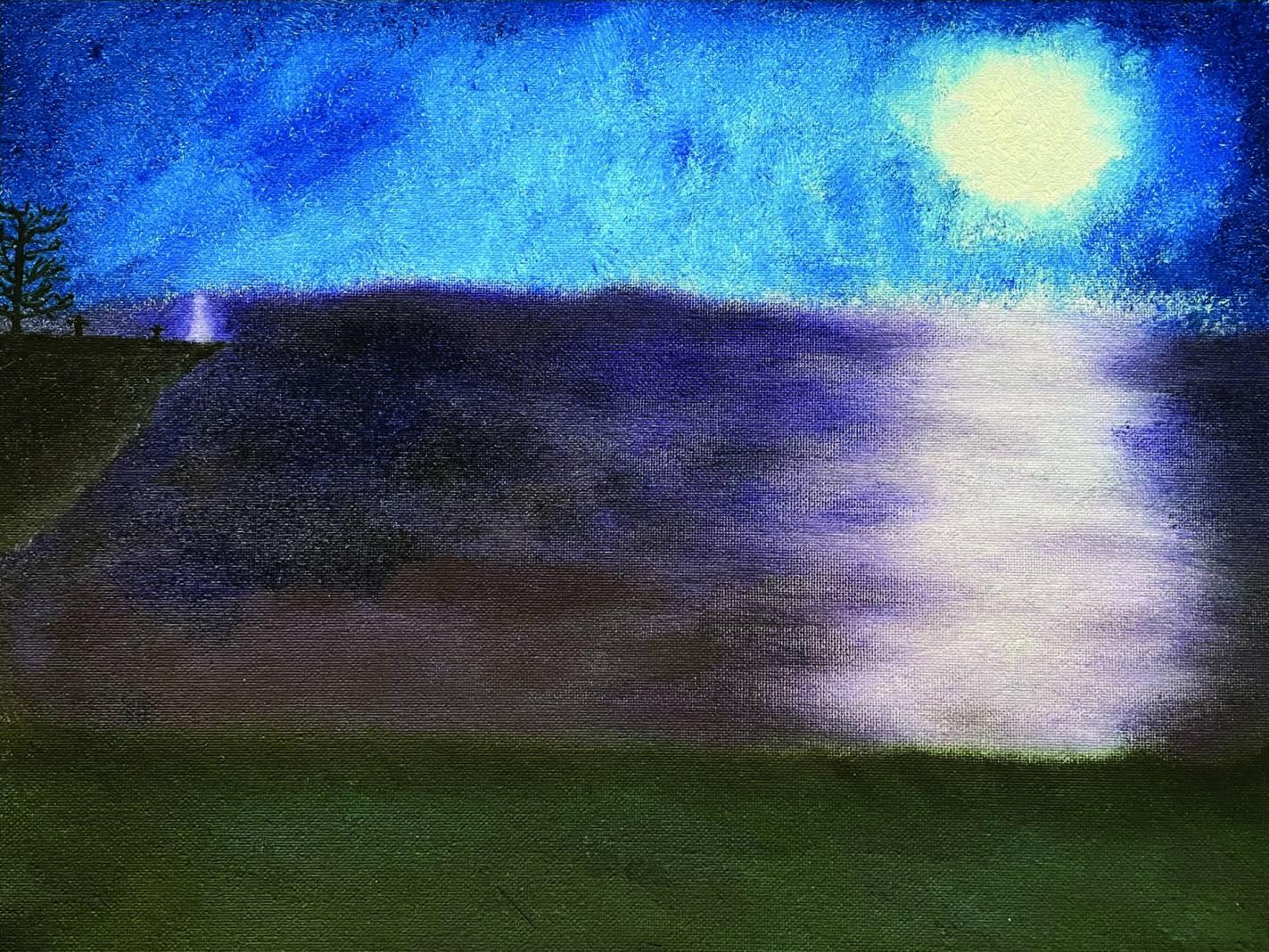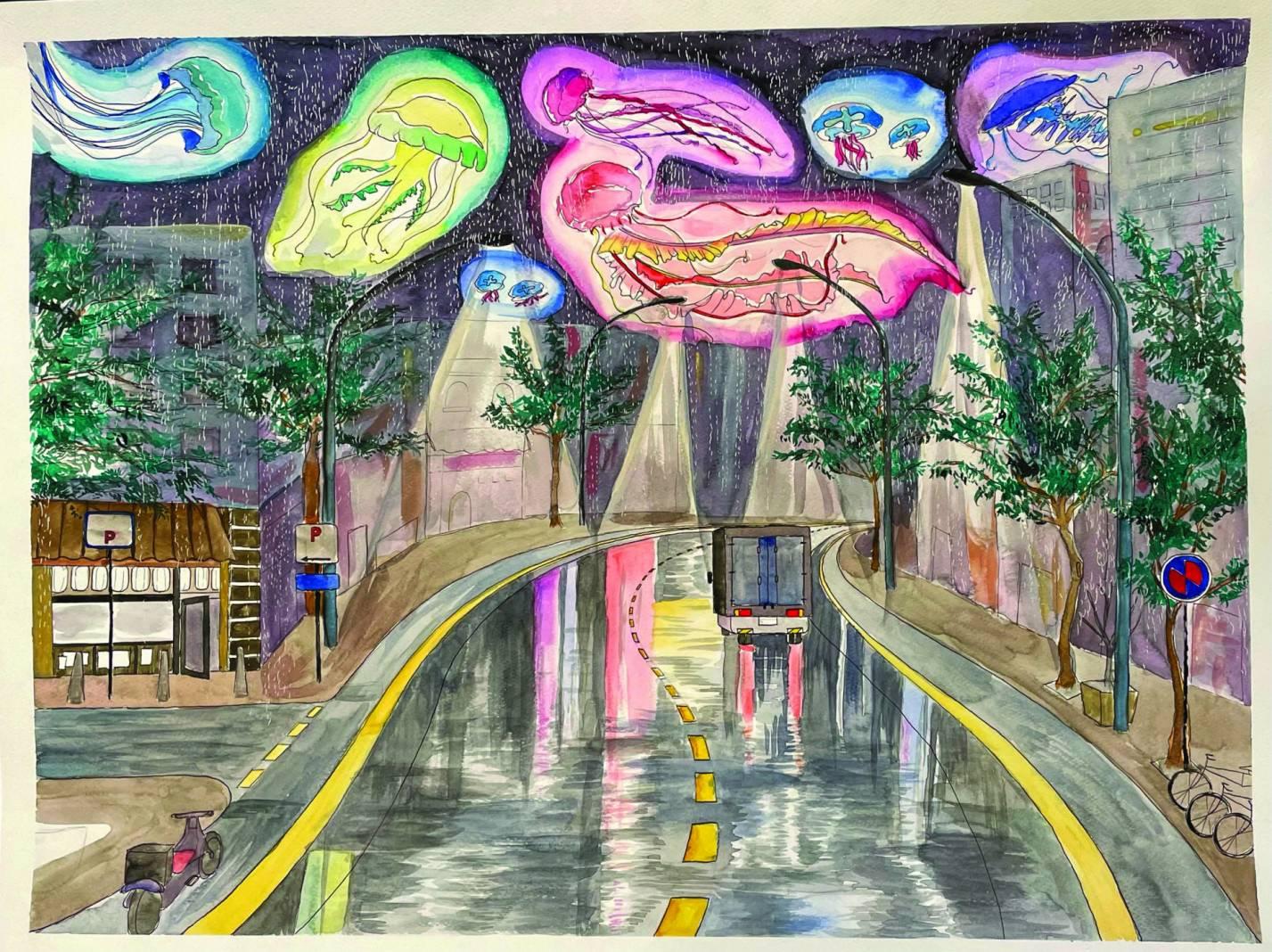 With this artwork, I wanted to purely explore the characteristics of water and how it reflected light. I wanted to achieve a reflective surface on the road, and through this, reflect the vibrant colours of the glowing jellyfish. The meaning that I wanted to achieve with this artwork was to establish that the jellyfish were part of this scene, that these two worlds of fantasy and reality coexisted. I further reinforced this idea through the coloured reflections of the Wandering Lanterns on the winding road.