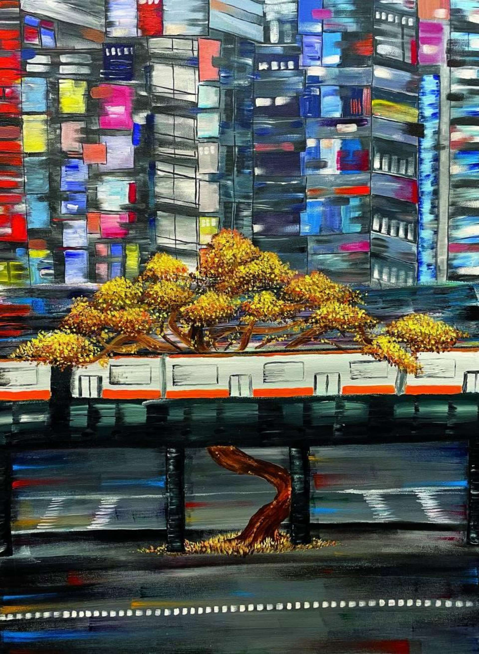 With the bonsai tree as the main focal point of the work, I wanted to root its existence within the piece to demonstrate the idea of the natural and artificial world coexisting, despite being such contradictory worlds. I chose to name the work Evergrow, in reference to nature’s constancy and eternity, despite the drastically changing urban world around it. The minimalism of the tree and the monochromatic golden colour of its leaves draws on the idea that simplicity can outshine grandeur extraordinarily.