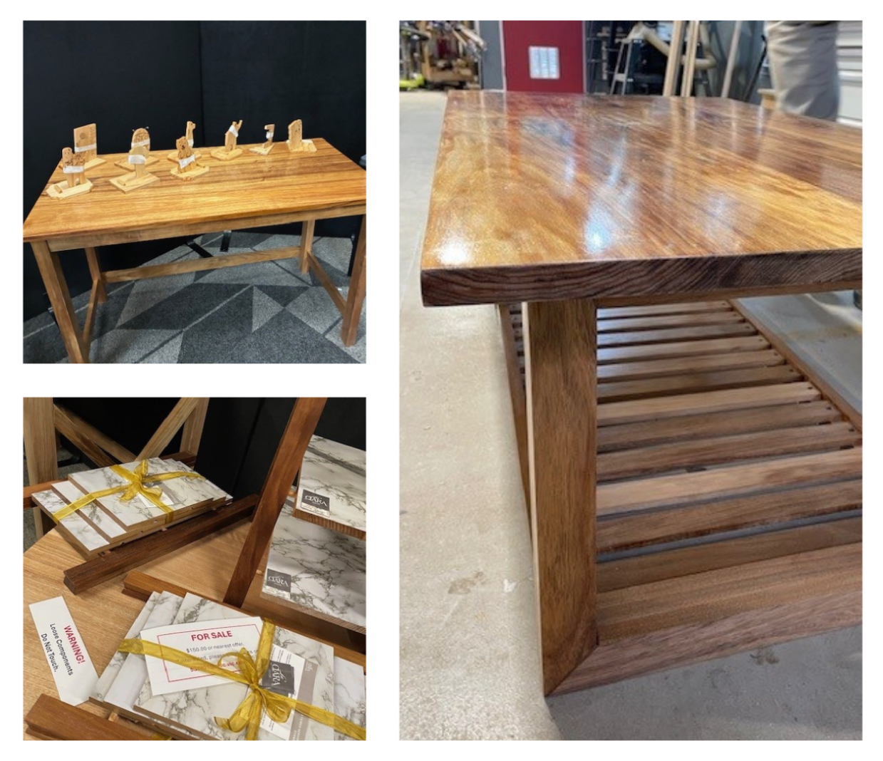 Pictured above, clockwise from top left: study table by Year 12 student Paul; solid blackwood occasional table by Year 10 student Ethan; afternoon tea stands by Year 11 student Ciara.