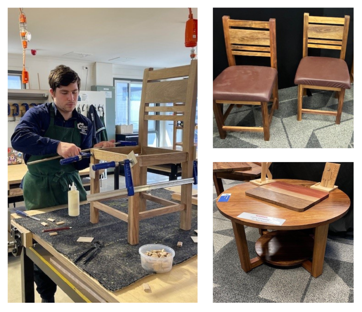 Pictured above, clockwise from left: Year 12 student Josef at work on his dining chairs; the finished dining chairs; circular occasional table by Year 10 student Raven.