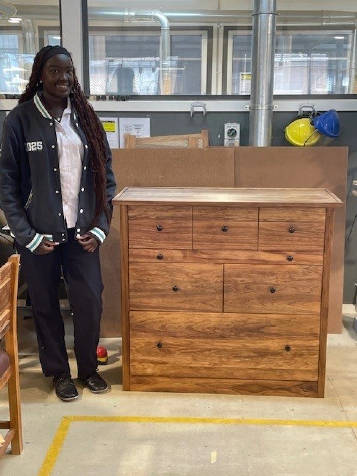 Pictured above, left to right: Year 12 student Aruai and her solid and veneered blackwood chest of drawers, finished in Tung Oil and Year 11 student Cooper with his solid feature grade, resin-filled, Tasmanian Oak study desk.
