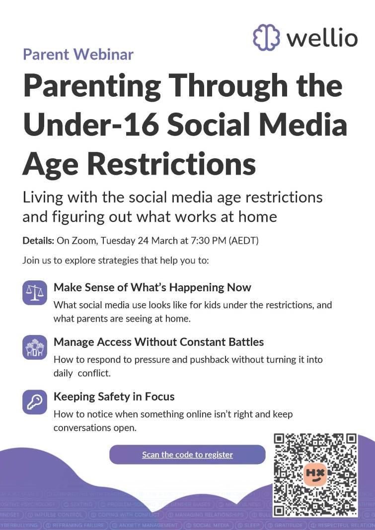 Parents and guardians are welcome to join a free Wellio webinar that will offer helpful advice on living with social media age restrictions and how to address them at home.