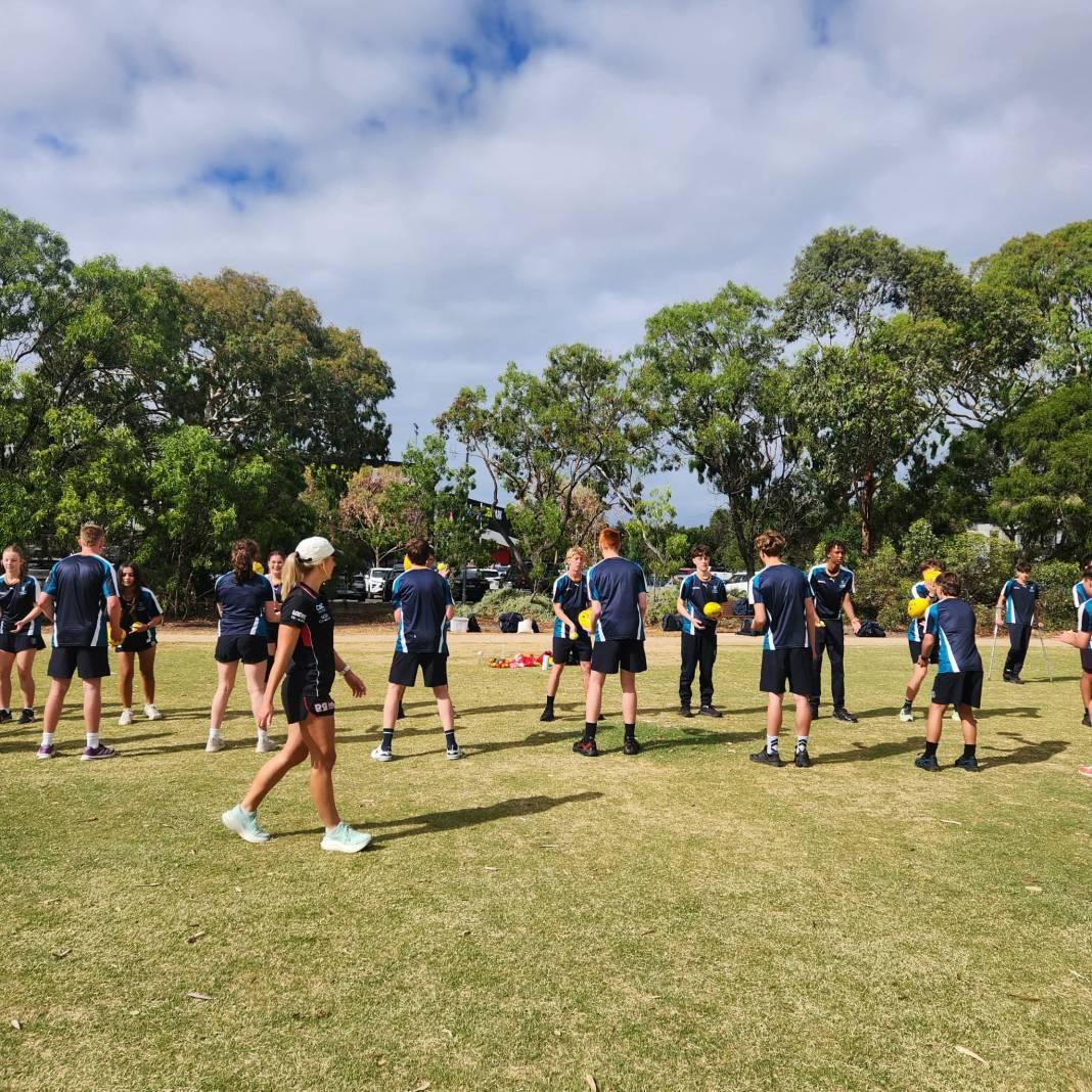 To start the day, students participated in an AFL skills session facilitated by St Kilda AFLW captain Hannah Priest. For students without a background in football, this session offered an opportunity to learn new skills, test their ability to adapt to a different sport, and pick up tips and tricks for coaching a group session.