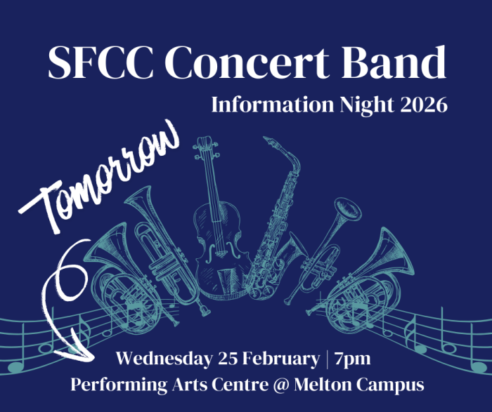 A reminder that families and aspiring musicians from both campuses are warmly invited to attend our Concert Band Information Night tomorrow, Wednesday 25 February.