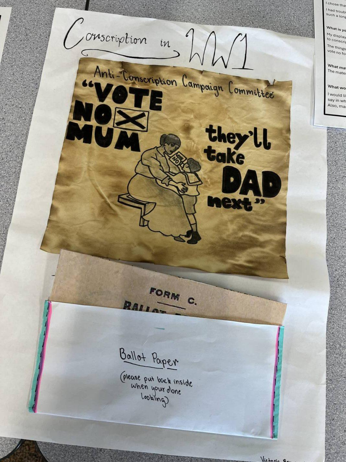 The World War 1 artefacts created by students took us back in time and explored many themes, including conscription, weapons, health, food and well-known soldiers such as Billy Sing.